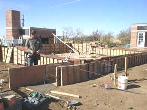 | Workshop student tying rebar in concrete bond beam above south window wall. Notice all threat post tensioning rod in PVC sleeve. |